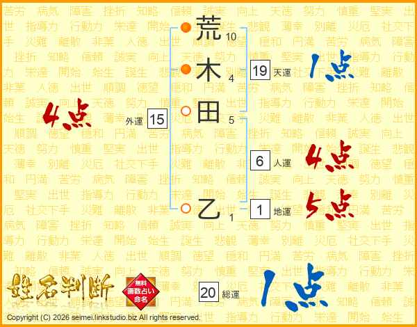 生活面を象徴する運勢です。外部から受ける影響力を表し、結婚運、家庭運や職場、環境への順応性を表します。総運から人運を引いた画数。姓や名が1文字の場合を除く。
