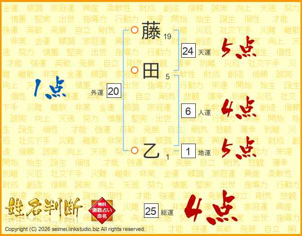 生活面を象徴する運勢です。外部から受ける影響力を表し、結婚運、家庭運や職場、環境への順応性を表します。総運から人運を引いた画数。姓や名が1文字の場合を除く。