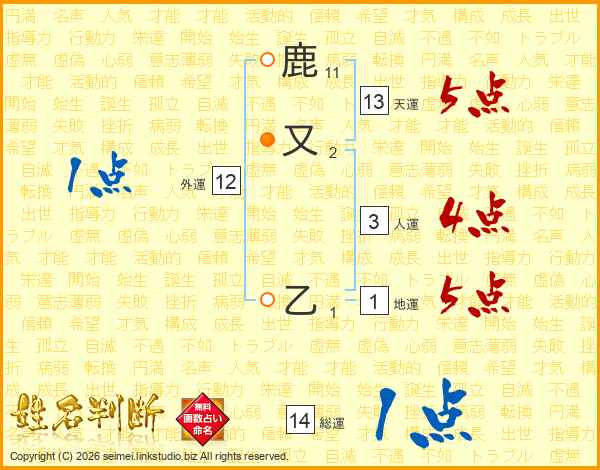 鹿又乙さんの総運は14画の1点!