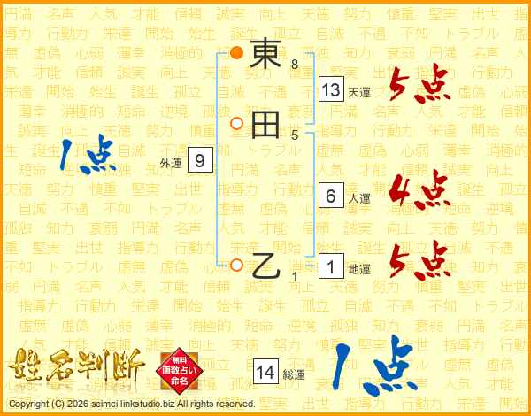 生活面を象徴する運勢です。外部から受ける影響力を表し、結婚運、家庭運や職場、環境への順応性を表します。総運から人運を引いた画数。姓や名が1文字の場合を除く。