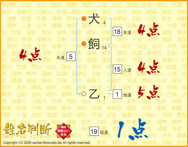 生活面を象徴する運勢です。外部から受ける影響力を表し、結婚運、家庭運や職場、環境への順応性を表します。総運から人運を引いた画数。姓や名が1文字の場合を除く。