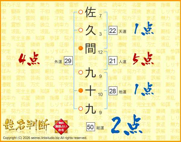 佐(7画)久(3画)間(12画) 九(9画)十(10画)九(9画)
