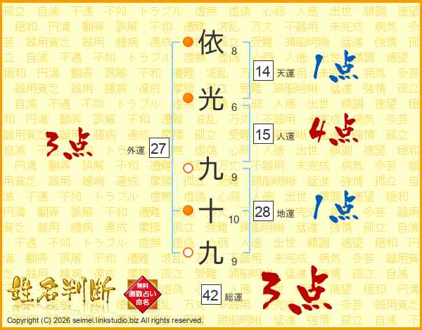 画数の奇数(○陽)と偶数(●陰)の配列で吉凶を占います。どちらかにかたよる名前は大凶名で避ける必要があります。画数の奇数偶数。