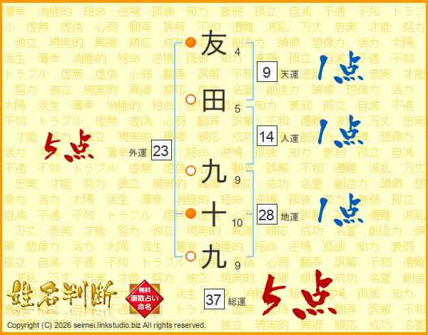 友田九十九さんの総運は37画の5点!