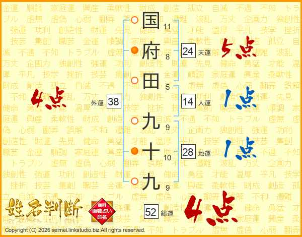 国(11画)府(8画)田(5画) 九(9画)十(10画)九(9画)