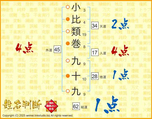 生活面を象徴する運勢です。外部から受ける影響力を表し、結婚運、家庭運や職場、環境への順応性を表します。総運から人運を引いた画数。姓や名が1文字の場合を除く。
