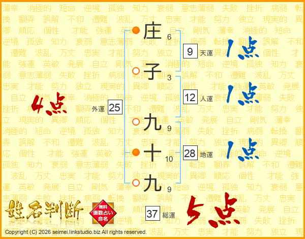 生活面を象徴する運勢です。外部から受ける影響力を表し、結婚運、家庭運や職場、環境への順応性を表します。総運から人運を引いた画数。姓や名が1文字の場合を除く。