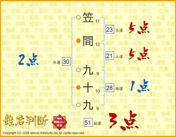 笠(11画)間(12画) 九(9画)十(10画)九(9画)