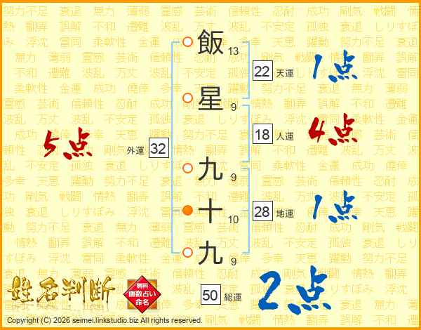 飯(13画)星(9画) 九(9画)十(10画)九(9画)