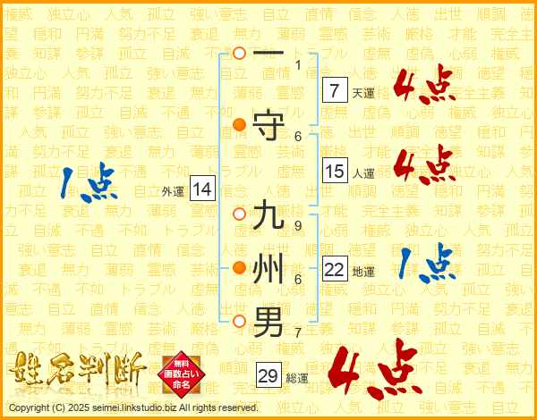 生活面を象徴する運勢です。外部から受ける影響力を表し、結婚運、家庭運や職場、環境への順応性を表します。総運から人運を引いた画数。姓や名が1文字の場合を除く。