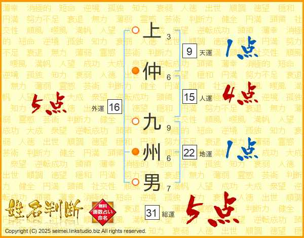 上(3画)仲(6画) 九(9画)州(6画)男(7画)