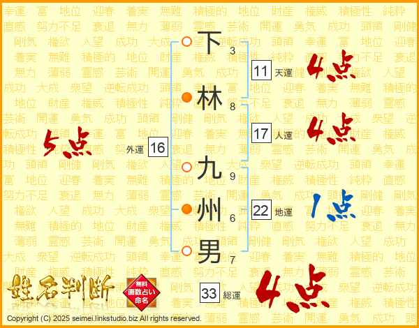 下(3画)林(8画) 九(9画)州(6画)男(7画)