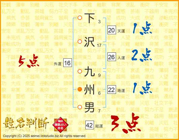 下(3画)沢(17画) 九(9画)州(6画)男(7画)