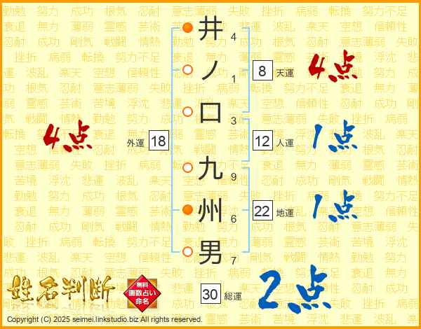 井(4画)ノ(1画)口(3画) 九(9画)州(6画)男(7画)