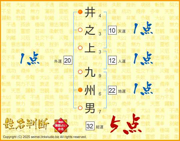 井(4画)之(3画)上(3画) 九(9画)州(6画)男(7画)