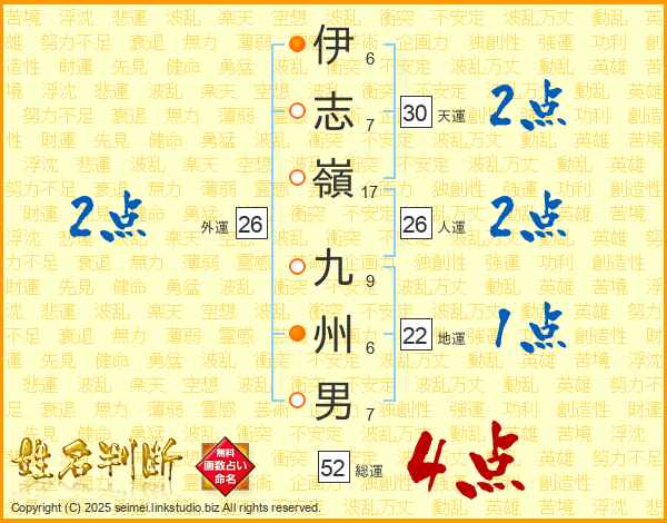 伊志嶺九州男さんの総運は52画の4点!
