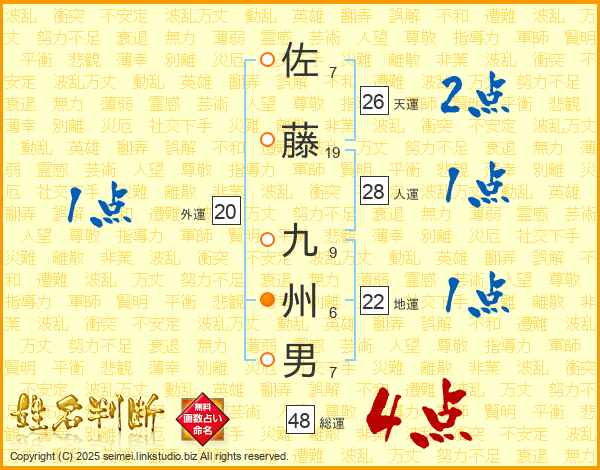 佐(7画)藤(19画) 九(9画)州(6画)男(7画)
