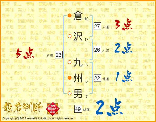 倉(10画)沢(17画) 九(9画)州(6画)男(7画)