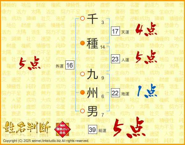 生活面を象徴する運勢です。外部から受ける影響力を表し、結婚運、家庭運や職場、環境への順応性を表します。総運から人運を引いた画数。姓や名が1文字の場合を除く。
