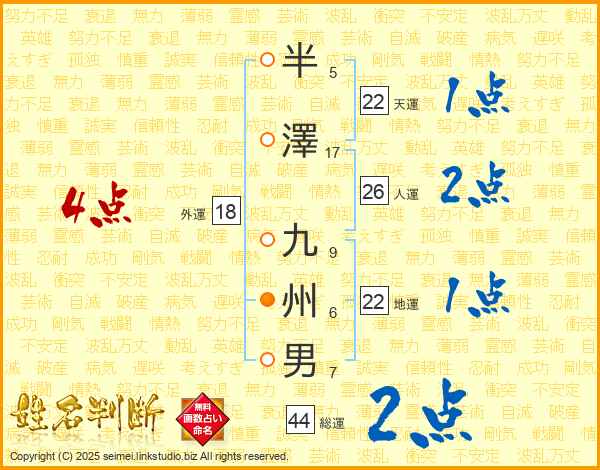 半澤九州男さんの総運は44画の2点!