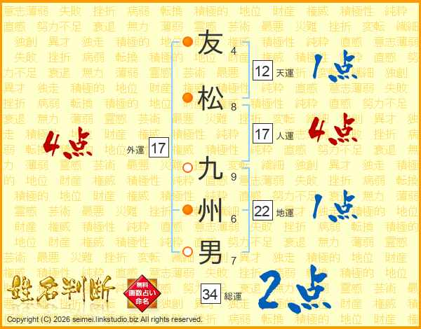友(4画)松(8画) 九(9画)州(6画)男(7画)