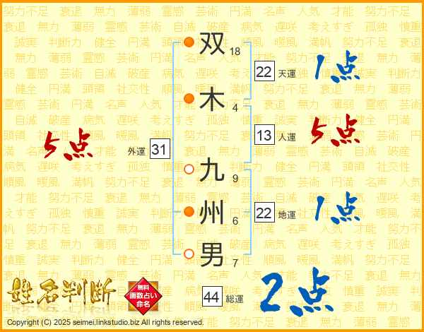双(18画)木(4画) 九(9画)州(6画)男(7画)