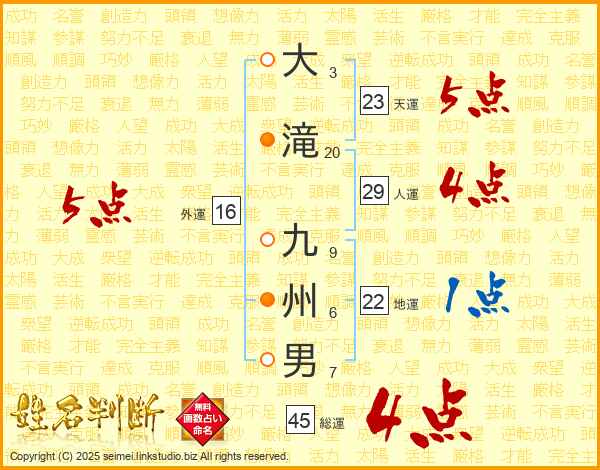 大(3画)滝(20画) 九(9画)州(6画)男(7画)