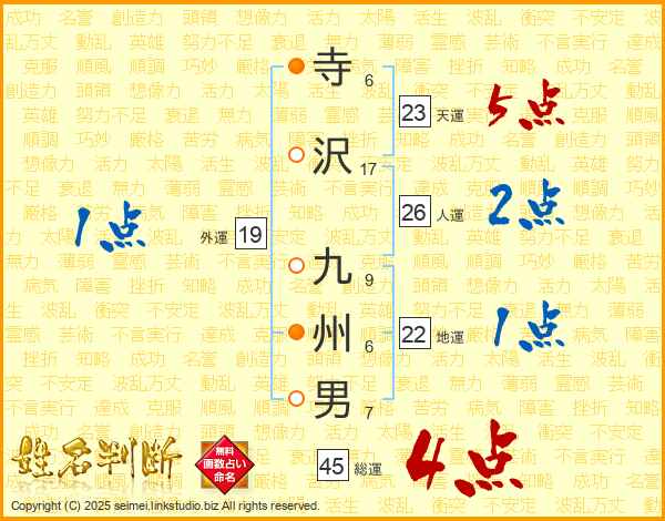 寺(6画)沢(17画) 九(9画)州(6画)男(7画)
