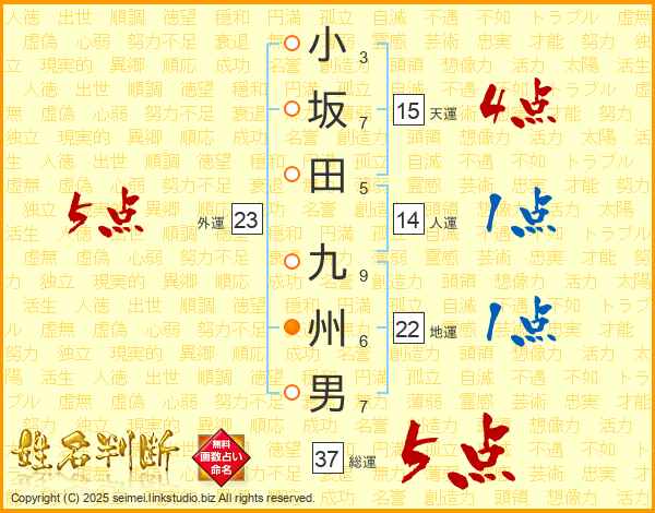 小(3画)坂(7画)田(5画) 九(9画)州(6画)男(7画)