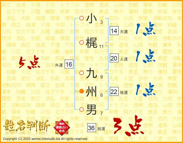 小(3画)梶(11画) 九(9画)州(6画)男(7画)