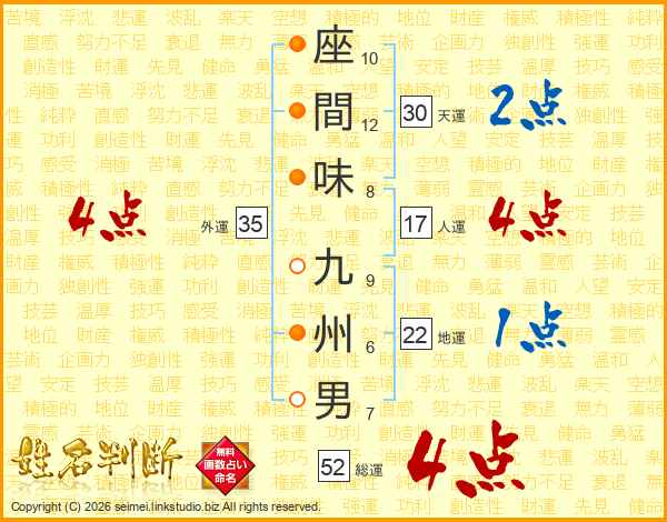 座(10画)間(12画)味(8画) 九(9画)州(6画)男(7画)