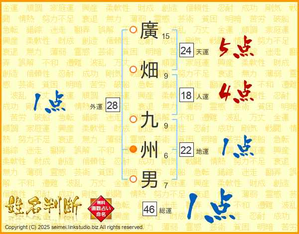 生活面を象徴する運勢です。外部から受ける影響力を表し、結婚運、家庭運や職場、環境への順応性を表します。総運から人運を引いた画数。姓や名が1文字の場合を除く。