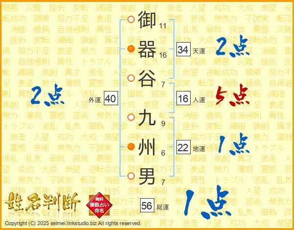 御(11画)器(16画)谷(7画) 九(9画)州(6画)男(7画)