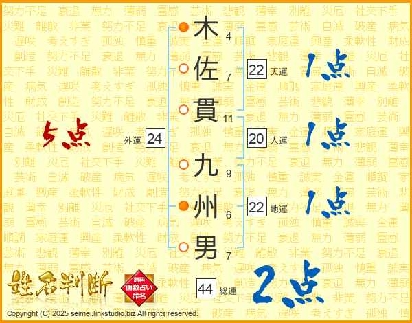 木(4画)佐(7画)貫(11画) 九(9画)州(6画)男(7画)