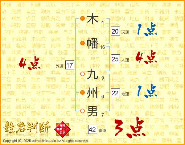 木(4画)幡(16画) 九(9画)州(6画)男(7画)