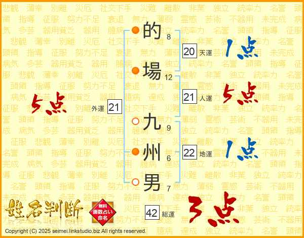 生活面を象徴する運勢です。外部から受ける影響力を表し、結婚運、家庭運や職場、環境への順応性を表します。総運から人運を引いた画数。姓や名が1文字の場合を除く。