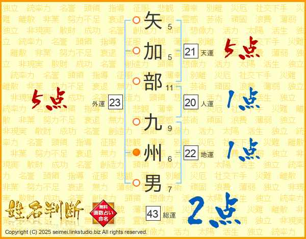 矢加部九州男さんの総運は43画の2点!