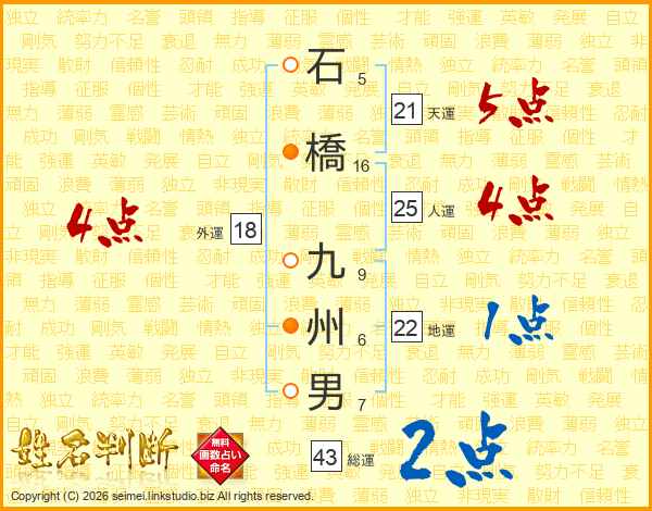 石橋九州男さんの総運は43画の2点!