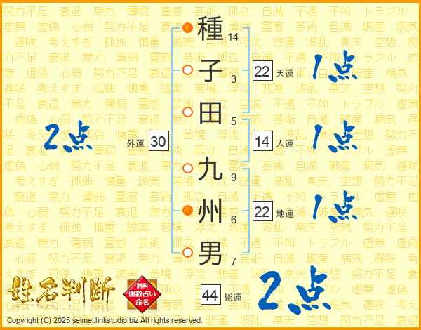 種(14画)子(3画)田(5画) 九(9画)州(6画)男(7画)