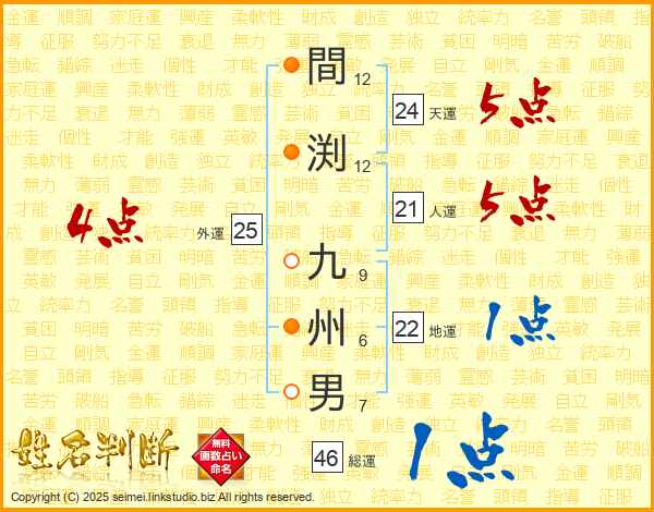 間(12画)渕(12画) 九(9画)州(6画)男(7画)