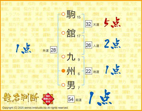 駒(15画)舘(17画) 九(9画)州(6画)男(7画)