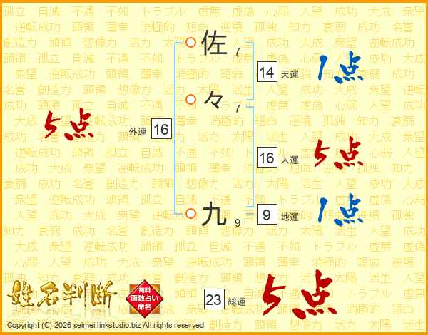 生活面を象徴する運勢です。外部から受ける影響力を表し、結婚運、家庭運や職場、環境への順応性を表します。総運から人運を引いた画数。姓や名が1文字の場合を除く。