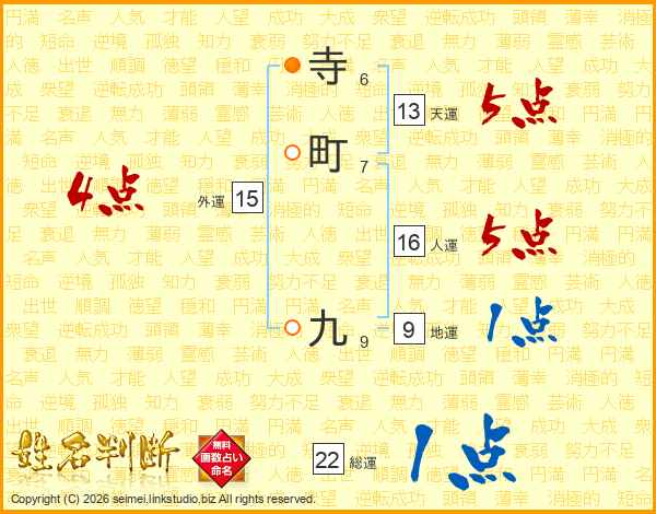 寺町九さんの天運は13画の5点
