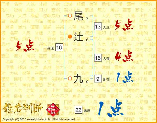 生活面を象徴する運勢です。外部から受ける影響力を表し、結婚運、家庭運や職場、環境への順応性を表します。総運から人運を引いた画数。姓や名が1文字の場合を除く。