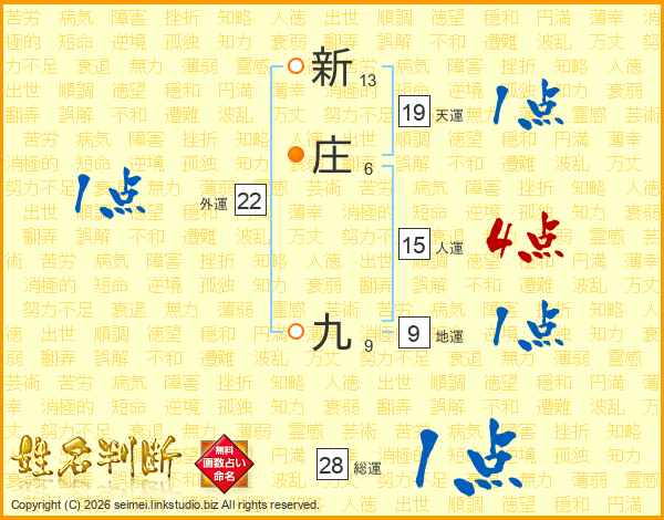 生活面を象徴する運勢です。外部から受ける影響力を表し、結婚運、家庭運や職場、環境への順応性を表します。総運から人運を引いた画数。姓や名が1文字の場合を除く。