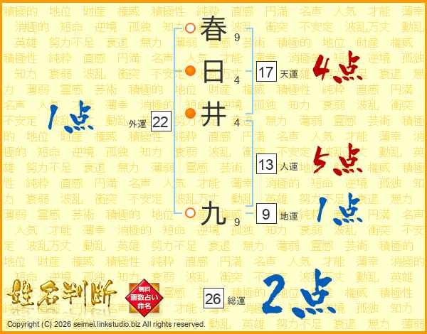 春日井九さんの総運は26画の2点!