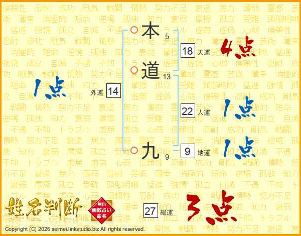 あなたの人生を表す1番重要な運勢です。生涯を通じて影響する総合運となり、主に50歳以降の晩年期に影響を及ぼします。苗字と名前の合計画数。