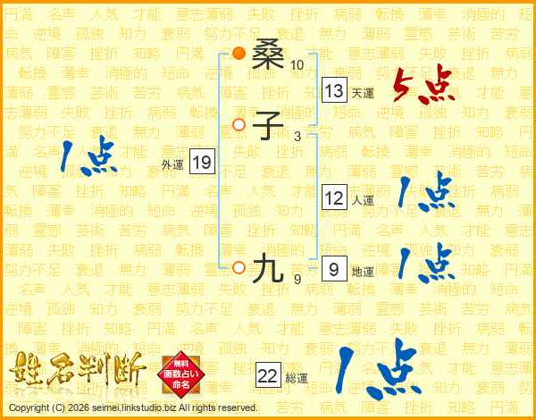 生活面を象徴する運勢です。外部から受ける影響力を表し、結婚運、家庭運や職場、環境への順応性を表します。総運から人運を引いた画数。姓や名が1文字の場合を除く。