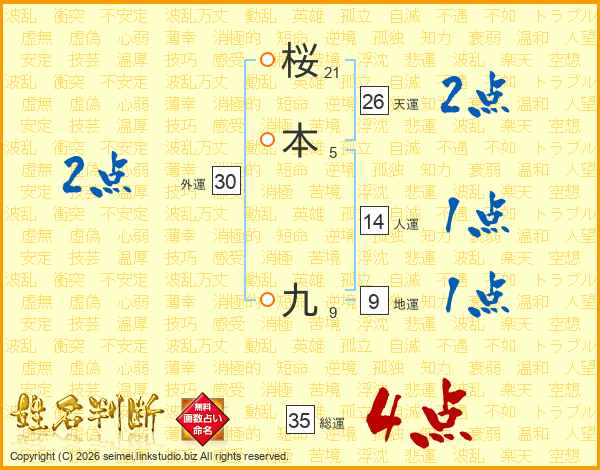 あなたの人生を表す1番重要な運勢です。生涯を通じて影響する総合運となり、主に50歳以降の晩年期に影響を及ぼします。苗字と名前の合計画数。