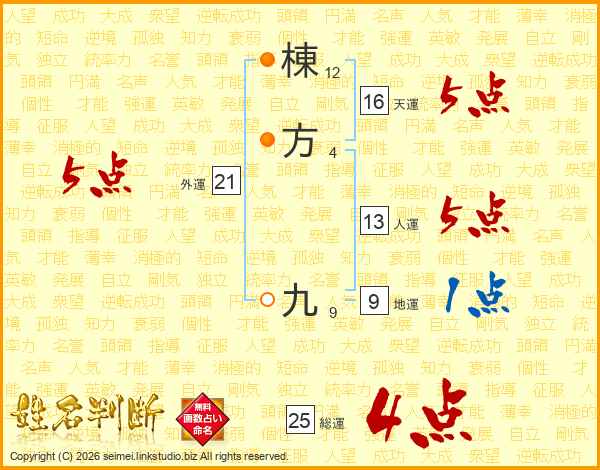 あなたの人生を表す1番重要な運勢です。生涯を通じて影響する総合運となり、主に50歳以降の晩年期に影響を及ぼします。苗字と名前の合計画数。